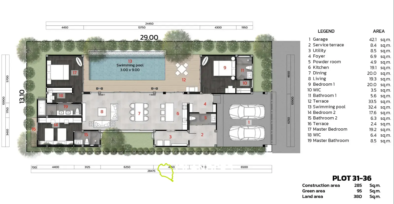 🌿 Land Plot Size: from 380 sqm to 450 sqm🏊 Private Pool: approx. 3 × 9 m