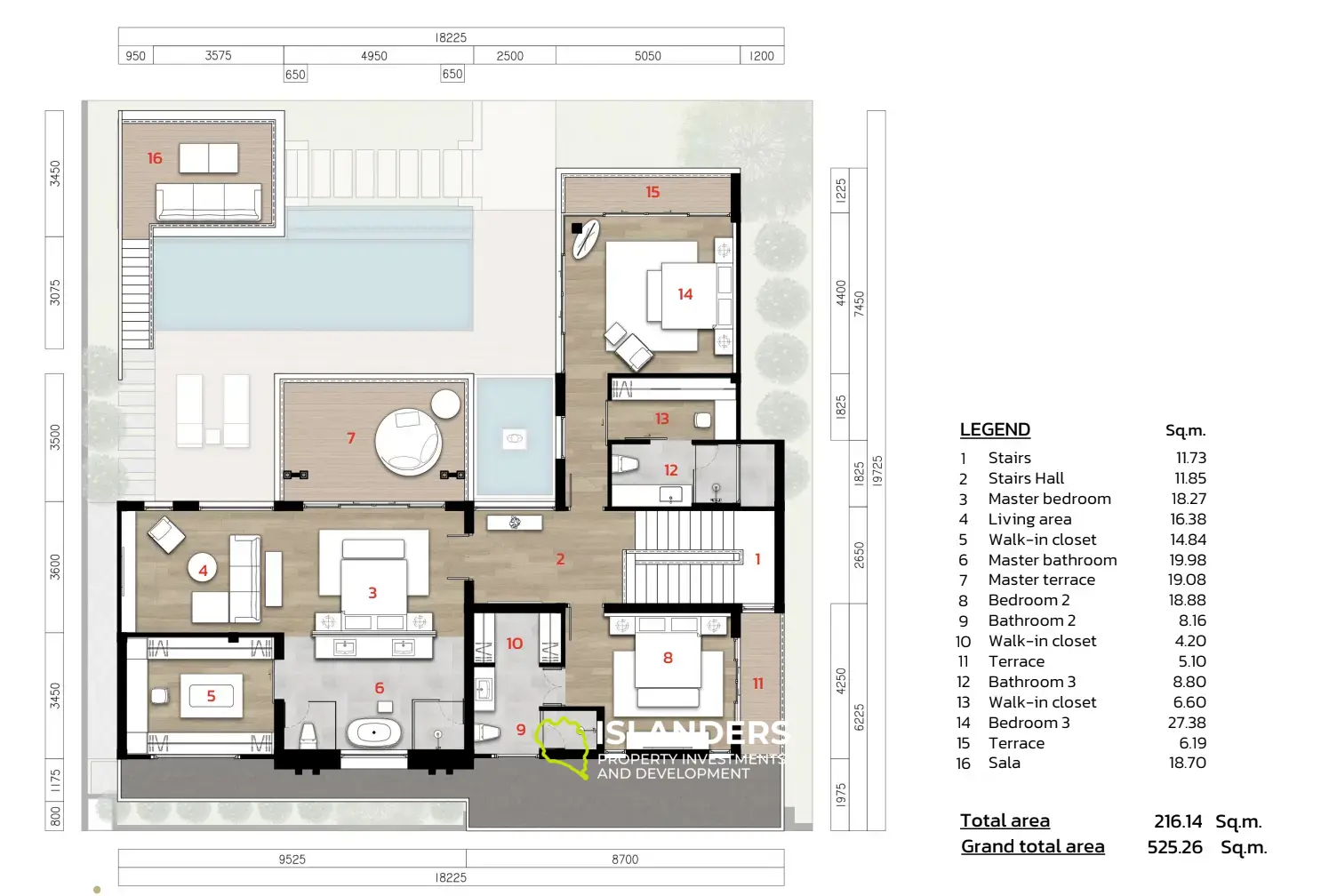 • Size: 525 m² (Building area), 33 m² (Terrace area)