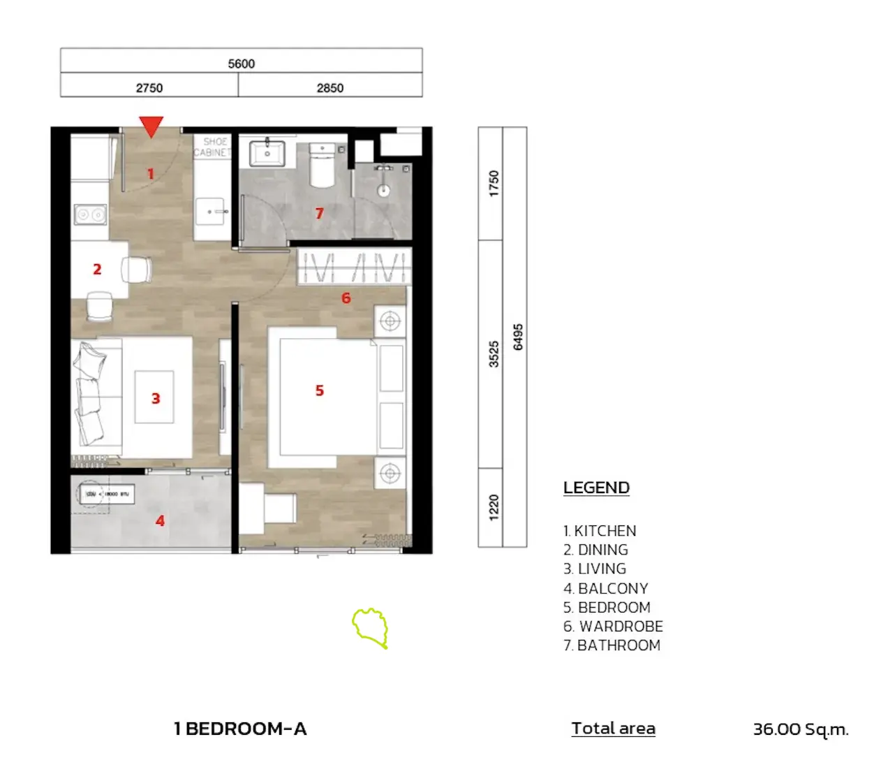 • 1 dormitorio Tipo A (36 m²): paquete de muebles 450,000 THB, beneficio de propiedad plena 400,000 THB