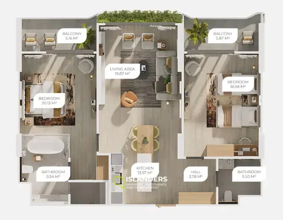 האזור המגונן (21.95 מ²) זורם בצורה חלקה למטבח מודרני (18.64 מ²) עם אזור אוכל המיועד לנוחות יומיומית. חדר השינה (15.70 מ²) מספק נוחות ופרטיות, בעוד שחדר האמבטיה (9.82 מ²) מציע גימורים באיכות גבוהה ואמבטיה למגע של יוקרה.