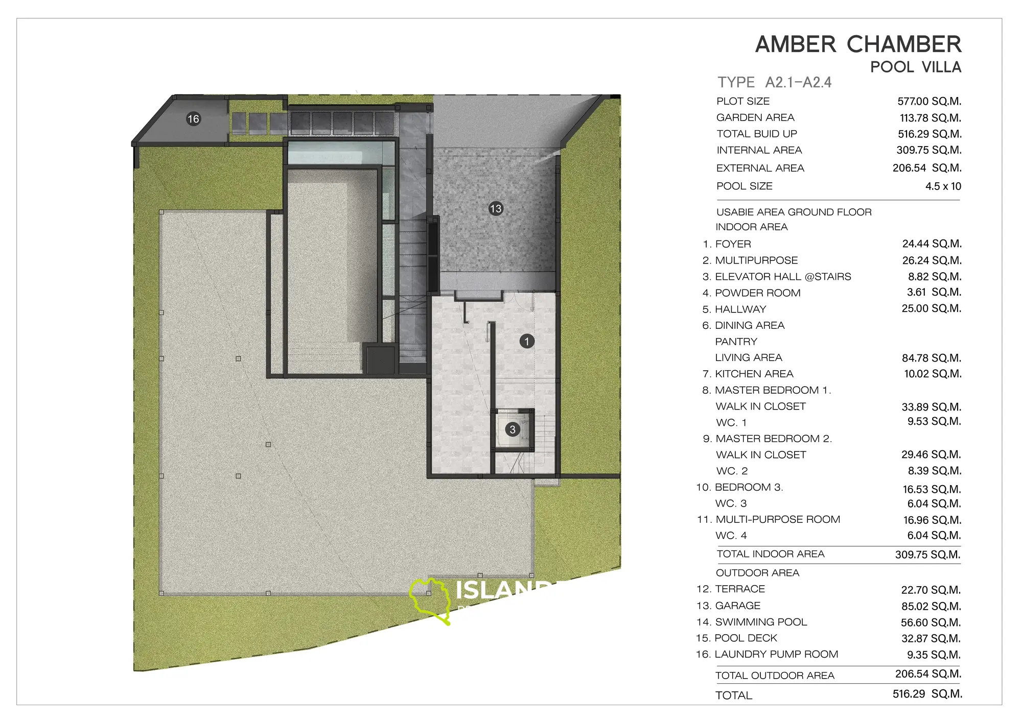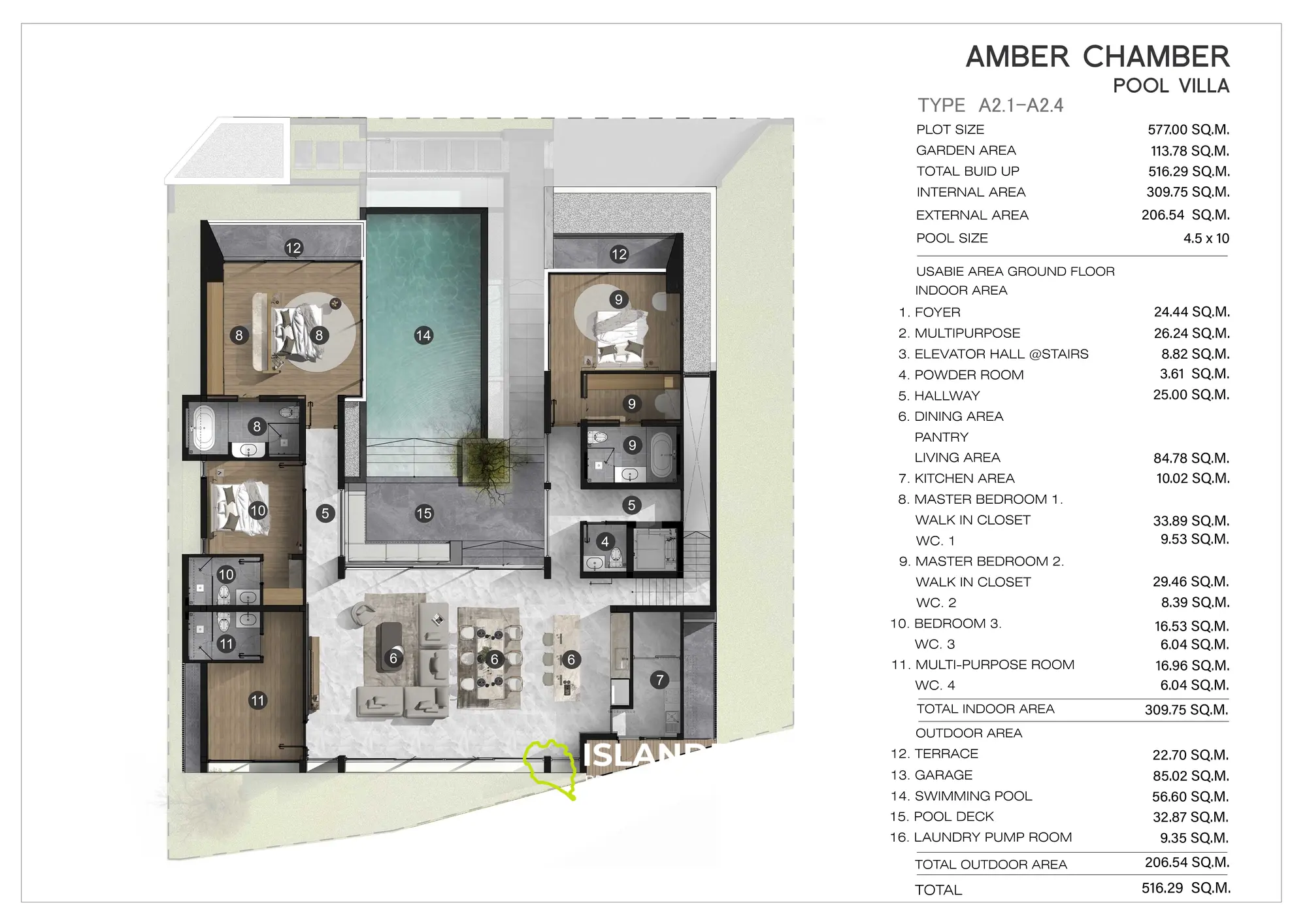 A refined 4-bedroom, 4+1 bathroom residence with a land area of 577 sq.m. and a living space of 516.29 sq.m. Thoughtfully designed for modern tropical living, the villa offers expansive interiors with an open-plan living and dining area, a sleek contemporary kitchen, and floor-to-ceiling glass doors that invite natural light throughout the home.