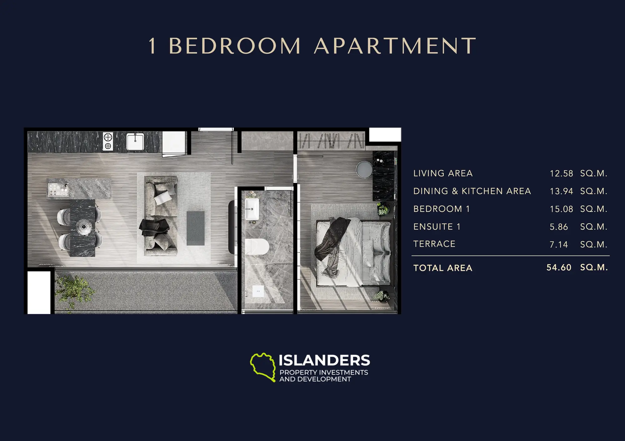 This exquisite condo, currently on plan, is set to be completed in 2027. With a spacious building area of 55 m² and a cozy interior space of 48 m², it offers the perfect balance of comfort and style. The 7 m² terrace invites you to enjoy the gentle breeze and the beautiful garden view.