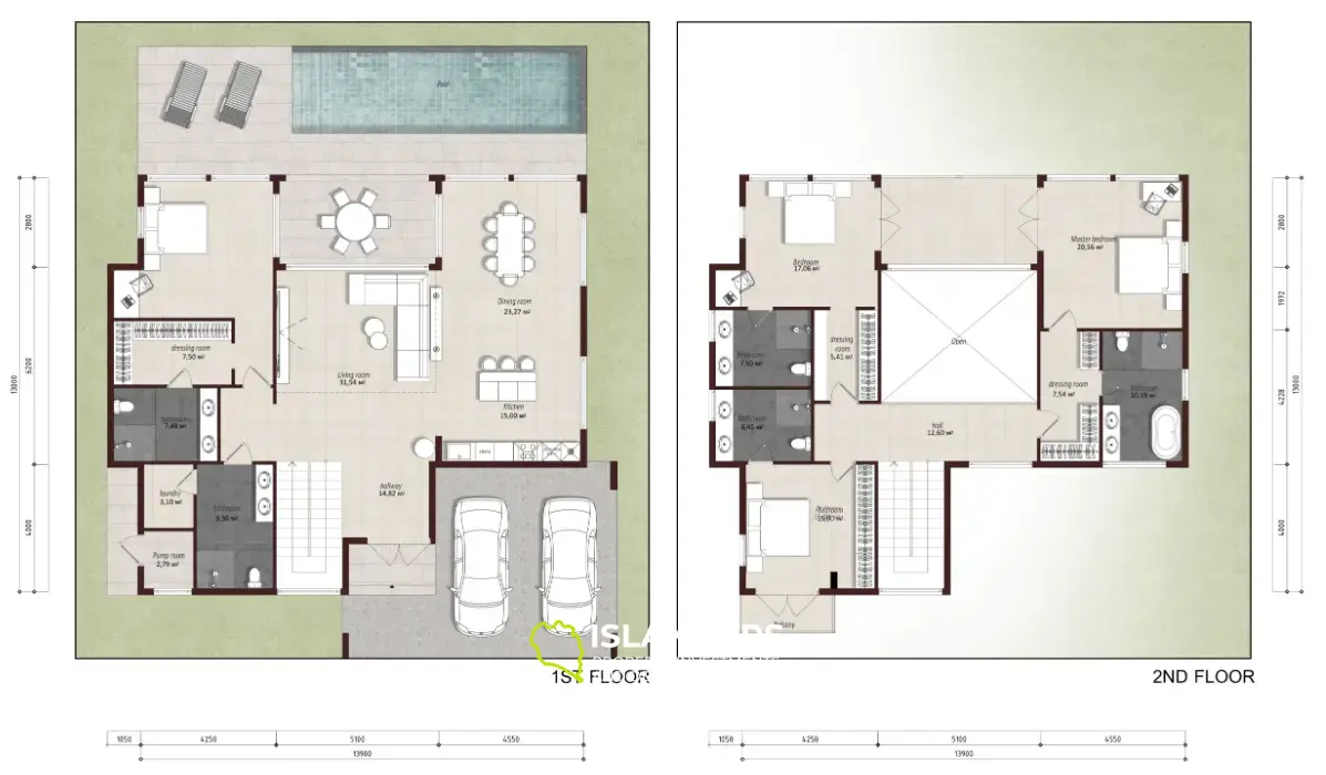 Эта просторная двухэтажная вилла продуманно спроектирована, чтобы сочетать элегантность с комфортом. На первом этаже жителей встречает открытая гостиная, которая плавно переходит в современную кухню и обеденную зону. Большие раздвижные двери соединяют внутреннее пространство с частным бассейном и солнечной террасой, создавая идеальные условия для отдыха или развлечений. Практичные особенности включают прачечную, кладовую, насосную и крытую парковку для двух автомобилей.